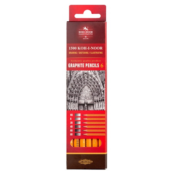 The Art Set, made up of the legendary KOH-I-NOOR HARDTMUTH 1500 graphite pencils, offers artists a comprehensive range of six pencils, from HB to the softer grades B, 2B, 4B, 6B and 8B. These hardnesses are the most useful for drawing. The set offers a comprehensive range of tools for capturing details, drawing precise lines, shading, hatching large areas and sketching.