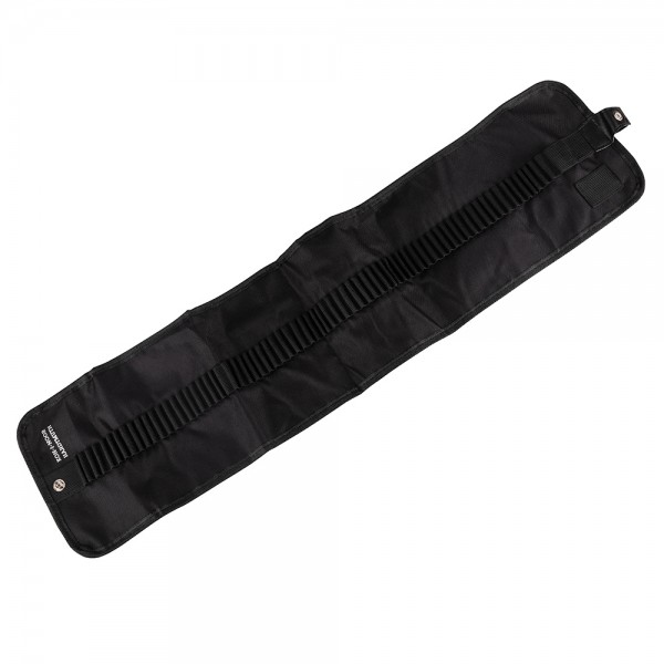 A textile rolling pen case for 72 coloured pencils depending on choice of the customer. There is a loop for an eraser and a small pocket for a sharpener. The pencil case has black colour. The loops for the coloured pencils and the eraser, and the pocket for the sharpener are made from textile rubber. After rolling, the pencil case is closed with a press stud on the textile rubber.