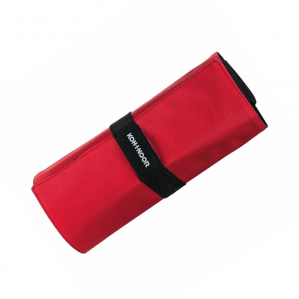A textile rolling pen case for 72 coloured pencils depending on choice of the customer. There is a loop for an eraser and a small pocket for a sharpener. The pencil case has black colour. The loops for the coloured pencils and the eraser, and the pocket for the sharpener are made from textile rubber. After rolling, the pencil case is closed with a press stud on the textile rubber.