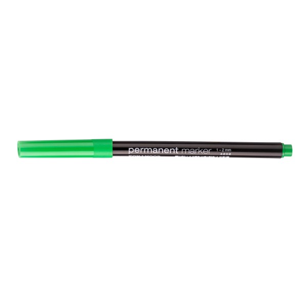 Feutres permanents 4202 remplis avec des encres à base d'alcool, rouge, bleu, vert et noir. La largeur de la trace est l'abrasion, l'eau et résistant aux intempéries. Peut être utilisé pour la plupart des surfaces: en particulier pour l'écriture sur des matériaux non poreux tels que les métaux, le verre, la porcelaine, le plastique, le cuir, le bois, le béton et la pierre, du carton, du carton. Si nécessaire, l'alcool peut être utilisé pour éliminer les traces de matériaux non poreux. Equipé de conseils rondes de 2 mm de diamètre, avec 1-2 mm de largeur de trace et 600m longueur de trace. Emballé dans des boîtes de papier, 12 pièces de chaque couleur, dans des ensembles de 4 pièces dans des boîtes en plastique,