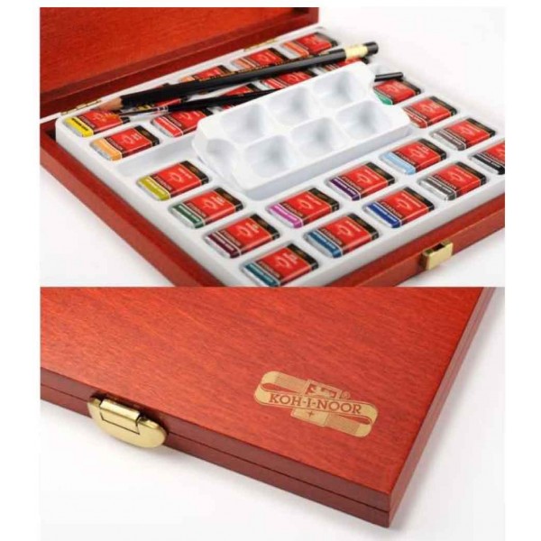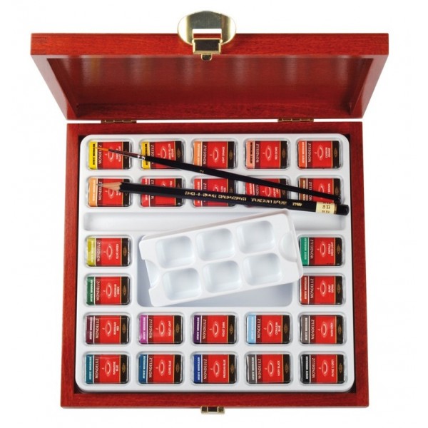 Boîte en bois à 24 pcs. aquarelle assorti; y compris crayon graphite 1500/3B + pinceau ronde et palette.