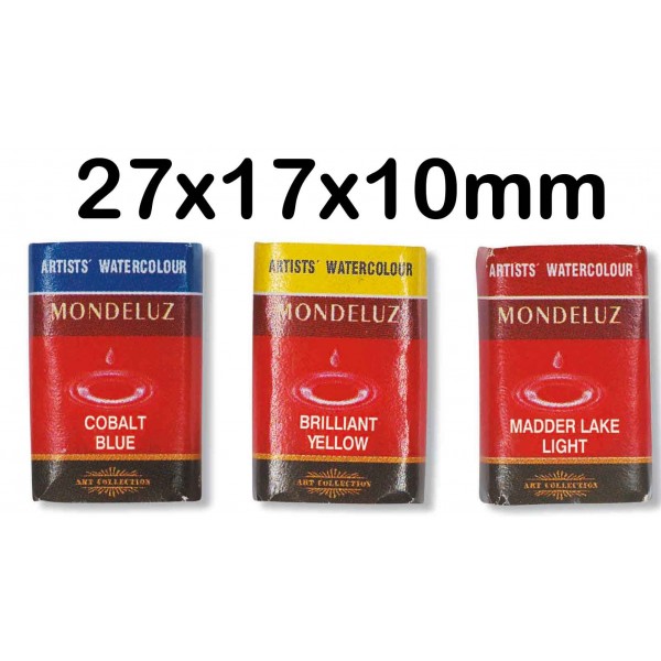 MONDELUZ peintures à l'aquarelle sont transparents avec des couleurs vives et une couverture très faible, pour la peinture de la technique de l'aquarelle avec une brosse. Ils sont livrés sous forme de comprimé solide dans des plateaux en plastique enveloppés dans une feuille d'aluminium et étiquetés. Les paramètres qualitatifs liés à l'opacité, haute résistance à la lumière et de la composition toujours mentionnés sur le marqueur. Disponible en 48 teintes