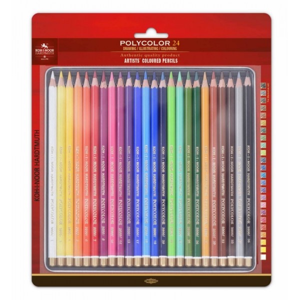 Set de 24 Crayon de couleur Polycolor dans un belle bôite de métal dans un blister practique. Quantité professionelle ø7mm, mine 3,8 mm. Taille blister 225 x 253 x 15 mm.