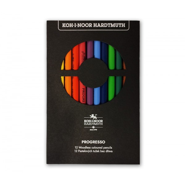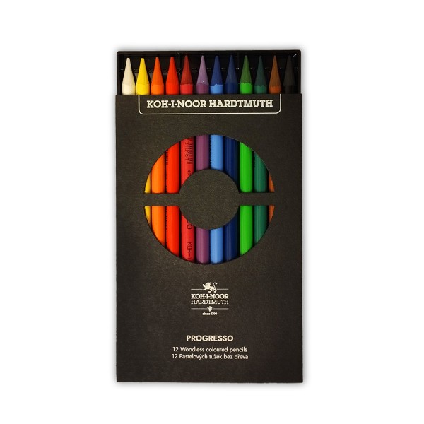 Set 12 coloured pencils, lacquered, (PROGRESSO). Without a wooden envelope, the entire section consists of a pastel lead. These pencils can be sharpened very easily and are suitable for school, hobby and artistic drawing. Due to its section, these pencils are particularly suitable for colouring large areas.