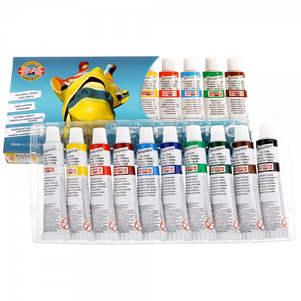 Peintures Tempera spécialement pour les écoles, mais aussi utilisés par des artistes professionnels. Ces peintures sont de haute qualité, d'épaisseur, peuvent être mélangés ensemble, sont, sûr et facile à laver soluble dans l'eau. Les peintures sèchent très rapidement et, une fois sec, peuvent être brossées avec de l'eau à nouveau. Ils sont basés sur des pigments finement dispersés dans un mélange d'huile approprié émulsion. Produit en 33 couleurs et dans de nombreux types d'emballages