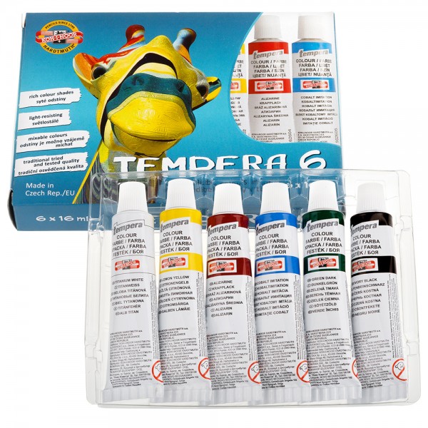 Peintures Tempera spécialement pour les écoles, mais aussi utilisés par des artistes professionnels. Ces peintures sont de haute qualité, d'épaisseur, peuvent être mélangés ensemble, sont, sûr et facile à laver soluble dans l'eau. Les peintures sèchent très rapidement et, une fois sec, peuvent être brossées avec de l'eau à nouveau. Ils sont basés sur des pigments finement dispersés dans un mélange d'huile approprié émulsion. Produit en 33 couleurs et dans de nombreux types d'emballages.