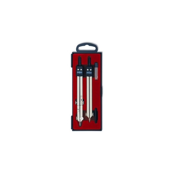 Un quatre-pièces avec compas en métal, emballé dans un étui de plastique dur noir avec couvercle transparent et Euro cintre, destiné aux écoles secondaires. Il se compose de passer de tôle avec télescope pour dessiner un cercle d'un diamètre de 5 à 450 mm, diviseur de métal pour diviser la taille de 3 à 130 mm, d'un tube avec des fils de rechange, et un tournevis à manche, stockée dans la surface préformée. Pièces métalliques enduits de nickel, de pièces de plastique noir. Titulaire plomb et accessoires de fixation diamètre de 3,5 mm.
