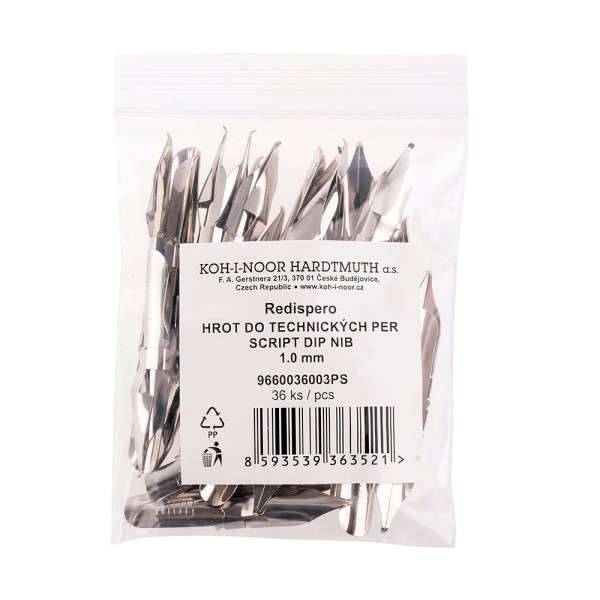 Set of 36 nibs in closable OPP bag. 36 pieces of nibs for technical pens with width of 1,0 mm inserted into closable OPP bag.