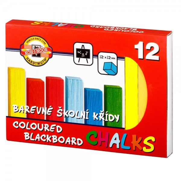 Set of 12 pieces of square coloured blackboard chalk 12 x 12 x 100 mm, designed for writing on a blackboard, inserted in a box with a printed sleeve.