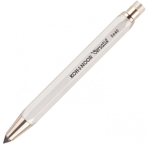 Vulpotlood, metaal, geschikt voor schrijven en tekenen, met een stift van 5,6 mm diameter. De stift wordt verplaatst door de slijperknop in elke gewenste positie te drukken, waardoor de klem opengaat en de stift eruit schuift. De knop heeft een slijper en de stift kan worden geslepen door de slijper eruit te draaien. De achthoekige envelop van het potlood is zilverkleurig gespoten. Het potlood heeft geen clip. Een label met EAN-code is op het potlood aangebracht. Groepsverpakking: 20 potloden los verpakt in een kartonnen doos. De potloden zijn voorzien van hoedenpapier.
